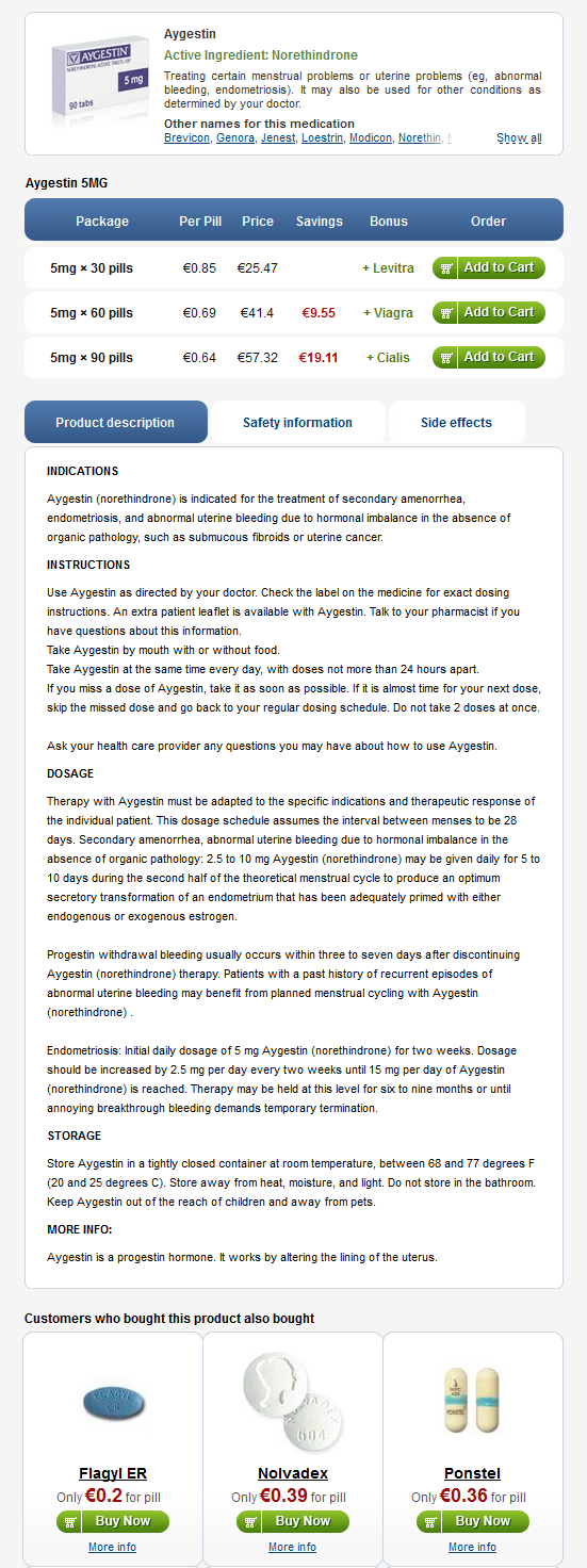 Sekundær amenoré, unormale uterine blødninger på grunn av hormonell ubalanse i fravær av organisk patologi: 2,5 til 10 mg Aygestin (noretisteron) kan gis daglig i 5 til 10 dager i løpet av den andre halvdel av det teoretiske menstruasjonssyklus for å frembringe en optimal sekretorisk transformasjon en endometrium som er tilstrekkelig primet med enten endogen eller eksogen østrogen.