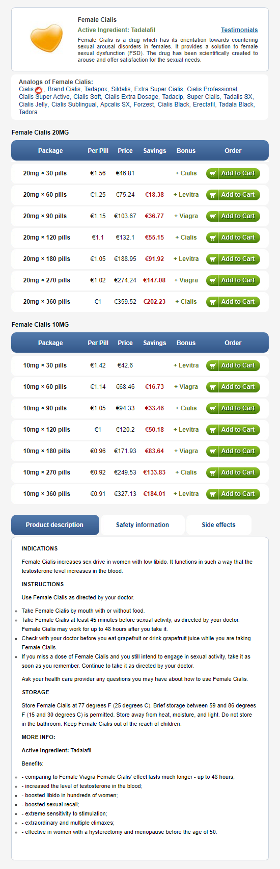 Resultatene av en rekke sosiale undersøkelser viser at kvinner lider av seksuelle forstyrrelser ikke sjeldnere enn menn: Ifølge noen data, hver tredje eller til og med en halvparten av alle kvinner står overfor seksuelle problemer fra tid til annen, eller hele tiden. Mange faktorer, blant annet stress, overworking, depresjon, fysiske kjennetegn eller misbalances og så videre, kan føre til redusert lyst og seksuell mislykkes. Mens menn har blitt bedre deres seksuelle helse ved hjelp av spesielle medisiner i mange år, har kvinner ikke hatt en slik mulighet til nå. Navnet på farmasøytisk innovasjon designet for kvinner er Kvinne Cialis og dets generiske analoger som fungerer i det velkjente måte som legemidler som brukes til behandling av seksuelle dysfunksjoner hos menn. Men før du bestemmer deg for å kjøpe kvinnelig Cialis anbefaler vi deg å få vite litt informasjon om dette stoffet.