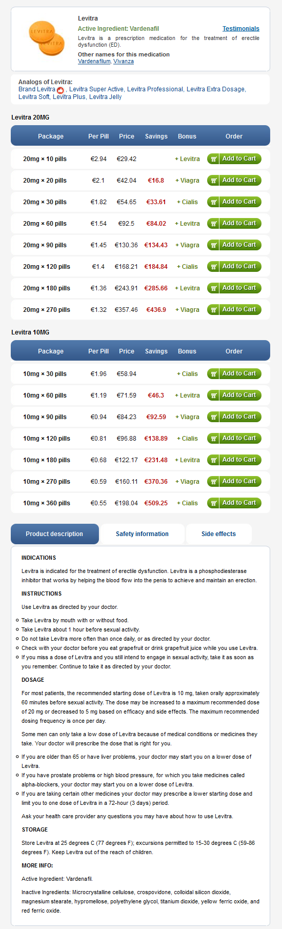 Maksimal dosering er foreskrevet for de vanskeligste tilfellene. Den anbefalte dosen bestemmes med legen din. Medisinen tas oralt én gang om dagen. Pass på at du ikke har kontraindikasjoner å ta Levitra før kjøpet. En slik beslutning er tatt på grunnlag av din medisinske historie og alvorlighetsgraden av erektil dysfunksjon .