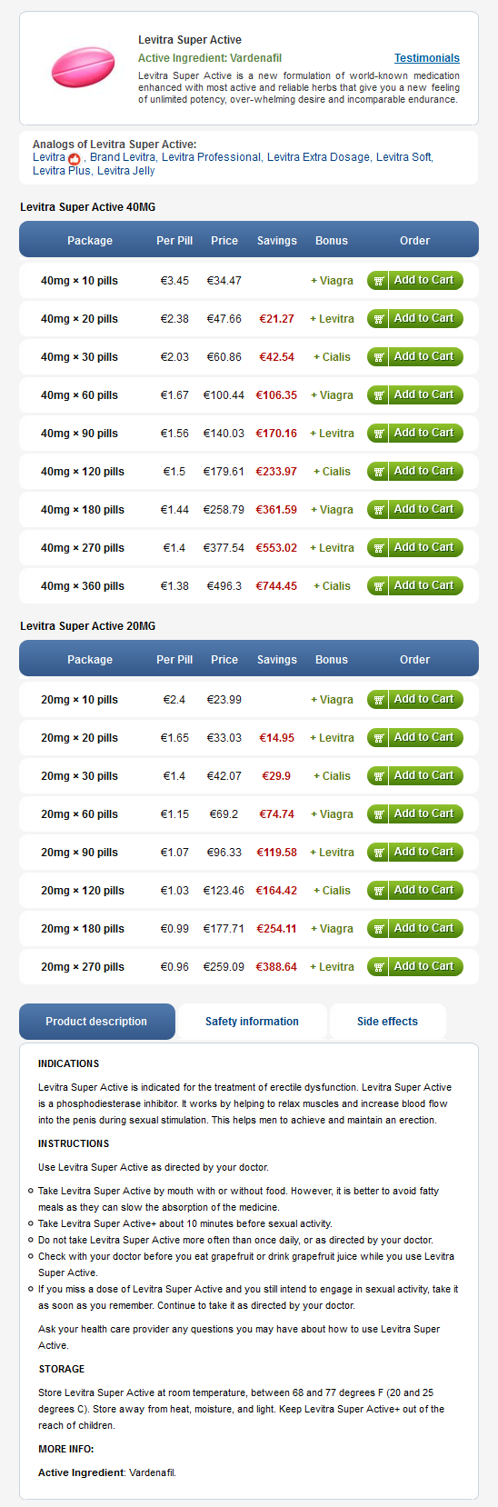 Hva er fordelen med Levitra Super Active? Du får en mulighet til å øke penis følsomhet og oppleve nye sensasjoner. Stoffet er tilgjengelig i røde kapsler. Hver kapsel inneholder 20 mg vardenafil. Sammenlignet med konvensjonelle Levitra, Super aktiv form har en lavere sannsynlighet for forekomst av bivirkninger. Likevel, husk stoffet kan forårsake hodepine, tett nese eller ansiktsrødme. Levitra er kontraindisert hos personer med anatomisk deformasjon av penis, samt tung sykdommer i hjerte-karsystemet. Levitra Super Active er en medisin for å overvinne ereksjonsproblemer. Advanced formel arbeider mer effektivt, samtidig som mekanismen er lik den av Viagra. Kliniske studier viser Levitra har flere fordeler i forhold til Viagra: det begynner å jobbe 16 minutter etter inntak, mens Viagra krever nesten en time av forventning.