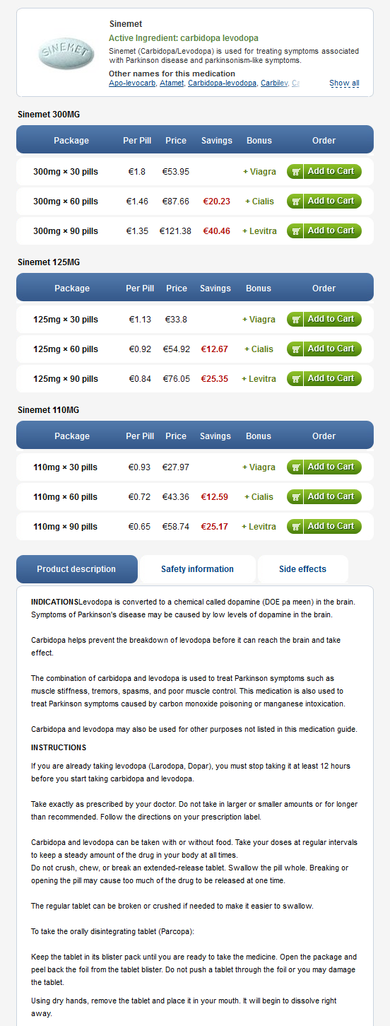 Sinemet er en antidyskinetic kombinasjon. Levodopa omdannes av kroppen og hjernen til en substans som bidrar til å redusere rystelser og andre symptomer på Parkinsons sykdom. Karbidopa hjelper levodopa å nå hjernen.