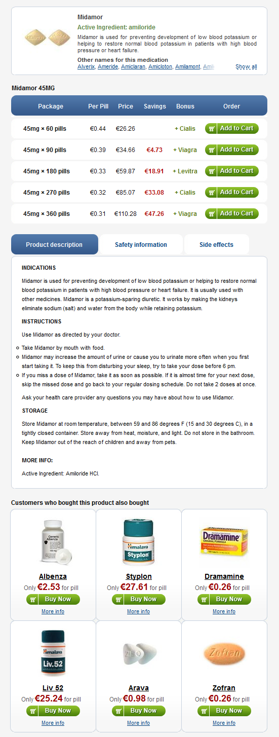 Midamor bør sjelden brukes alene. Den har svak (sammenlignet med tiazider) vanndrivende og blodtrykkssenkende effekter. Brukes som enkle midler, kaliumsparende diuretika, inkludert Midamor, resultere i en økt risiko for hyperkalemi (ca. 10% med amilorid). Midamor bør brukes alene bare når vedvarende hypokalemi er dokumentert og kun med forsiktig titrering av dosen og tett oppfølging av serumelektrolytter.