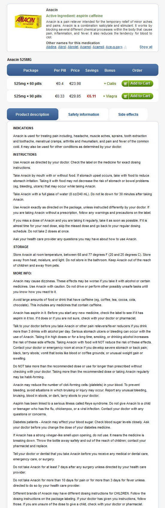 Tilgjengelighet og lagring : Anacin : caplets : Hver hvite caplet , trykt " Anacin " , inneholder : 325 mg ASA og koffein 32 mg . Nonmedicinal ingredienser: cellulose, maisstivelse , etoksyetanol , jernoksid , lecitin , farmasøytisk glasur, polyetylenglykol , propylenglykol, simethicon og natriumlaurylsulfat . Energi: 0,18 kJ ( 0,04 kcal ) . Natrium: <1 mmol ( <0,1 mg). Flasker med 50 og 100 .